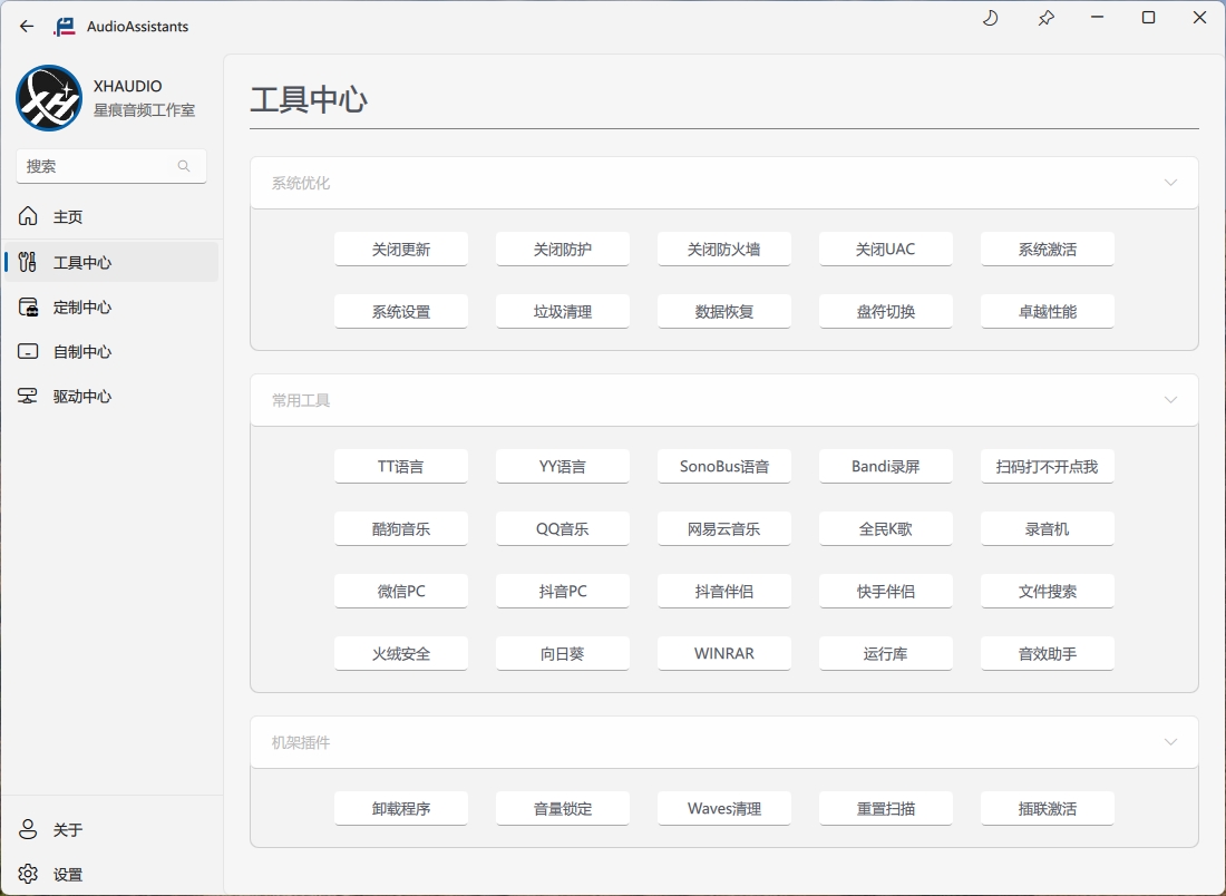 工具中心是系统优化、常用工具和机架插件工具功能区,主要是包括系统设置优化工具,主播常用软件和机架插件的工具等,长期更新添加;